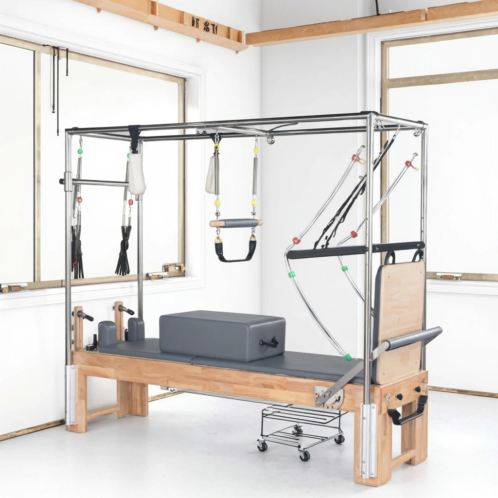 Professional-grade 3-in-1 Maple Cadillac Pilates Reformer, ideal for home gyms. Durable eco-friendly maple construction with multifunctional health features. Quality guaranteed for effective Pilates workouts at home.