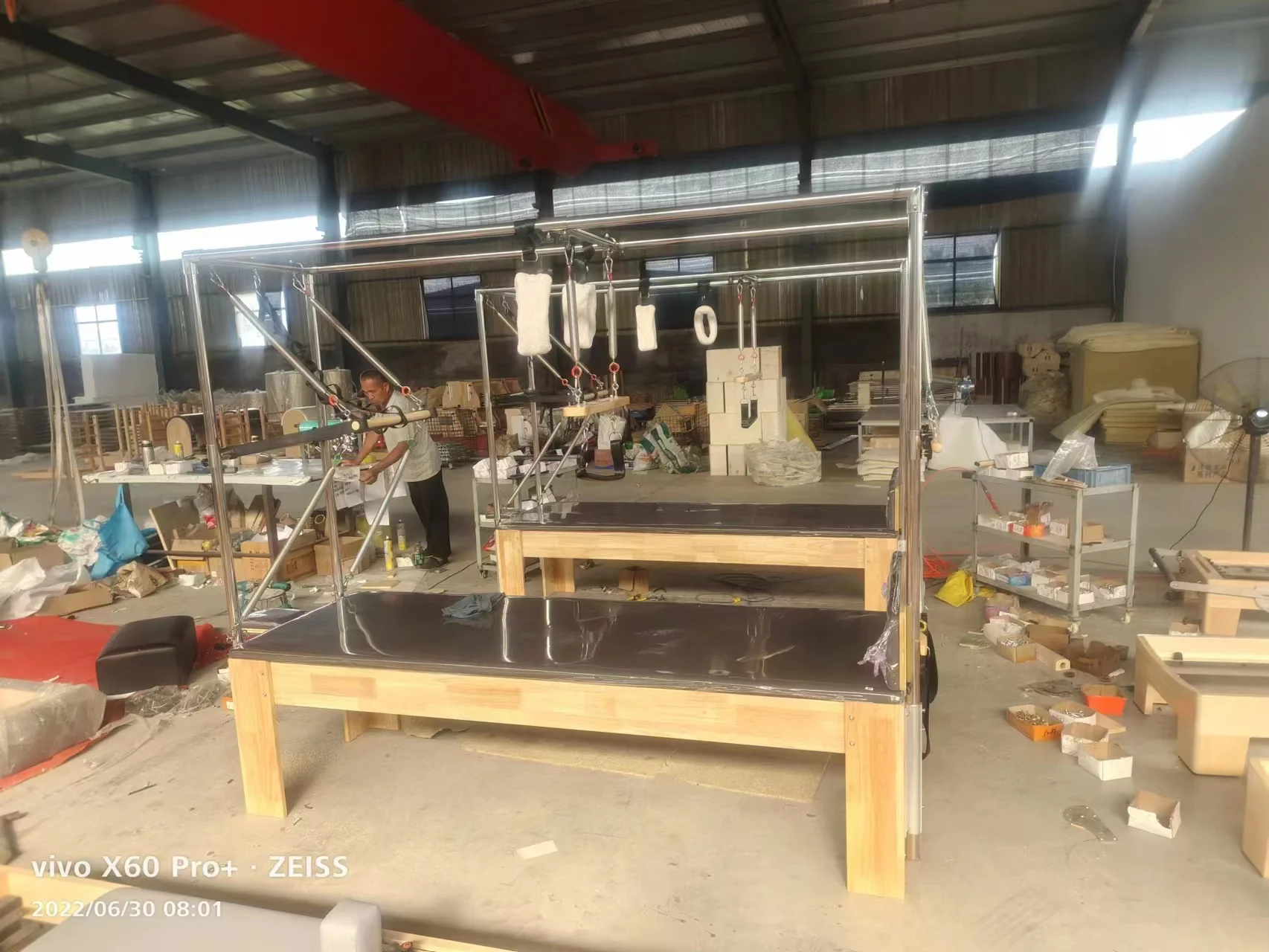 Professional indoor fitness equipment designed for wholesale, featuring maple wood construction and adjustable reformer cadillac with full trapeze, ideal for elevated bed workouts.